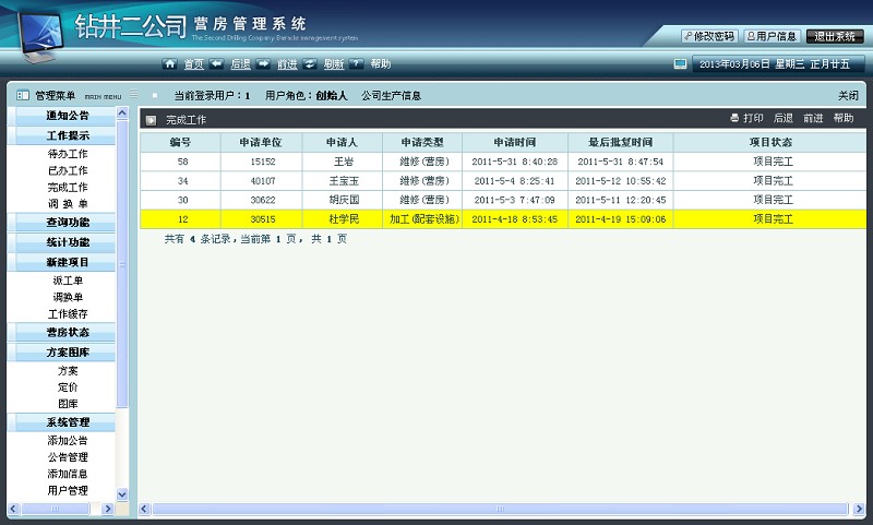 大慶鉆井二公司營房管理系統(tǒng)采用多用戶分等級權(quán)限的模式進(jìn)行管理。系統(tǒng)實現(xiàn)了企業(yè)在營房管理項目上的所有工作流程,用戶可以通過系統(tǒng)的工作流程提示在線審批自己的工作,系統(tǒng)的工作流程的實現(xiàn)借鑒了工作流的思想,采用多用戶協(xié)作的方式實現(xiàn)工作流程的推進(jìn),并且工作流程實現(xiàn)回滾的功能,工作數(shù)據(jù)時時更新,實現(xiàn)了對生產(chǎn)各環(huán)節(jié)的時時監(jiān)控的目的;系統(tǒng)實現(xiàn)營房基本信息收集、文件導(dǎo)入、查詢、統(tǒng)計、營房管理標(biāo)準(zhǔn)定制等功能。