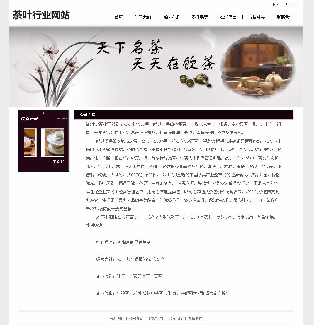 經(jīng) 過(guò)多年的發(fā)展與探索,公司于2007年正式創(chuàng)立“XX匯茶具量販”品牌超市連鎖銷售管理體系。在行業(yè)中采用全新的管理模式,公司本著精益求精的創(chuàng)新精神, “以誠(chéng)為本,以質(zhì)取勝,以客為尊”,以弘揚(yáng)中國(guó)茶文化為己任,不斷開拓創(chuàng)新,銳意進(jìn)取,為全世界品茶、愛(ài)茶人士提供高貴典雅產(chǎn)品的同時(shí),將中國(guó)茶文化發(fā)揚(yáng) 光大。“匯天下珍器,聚人間真情”,公司所經(jīng)營(yíng)的茶具品種多樣化,細(xì)分為:木質(zhì)、陶瓷、紫砂、竹制品、不銹鋼、玻璃六大系列,共6000多個(gè)品種。公司采 用全新的中國(guó)茶具產(chǎn)業(yè)超市化的經(jīng)營(yíng)模式,產(chǎn)品齊全,價(jià)格優(yōu)惠,服務(wù)周到,贏得了社會(huì)各界消費(fèi)者的贊譽(yù)。“感恩永恒,誠(chéng)信利業(yè)”是XX人的重要理念,正是以 其文化屬性促企業(yè)文化于經(jīng)營(yíng)管理之中,用倫之常理立商道,以倫之內(nèi)涵弘茶道引領(lǐng)茶具發(fā)展。XX人對(duì)茶道的崇尚和追求,體現(xiàn)了產(chǎn)品和人品的完美結(jié)合!做優(yōu)質(zhì) 茶具,做健康茶具,做知性茶具。用心服務(wù),讓每一位客戶來(lái)XX都感覺(jué)家一般的溫暖!